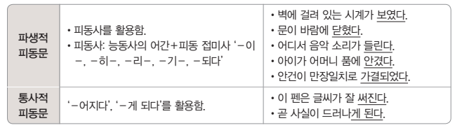 - 피동사: 능동사의 어간 + 피동 접미사 '-이-, -히-, -리-, -기- '