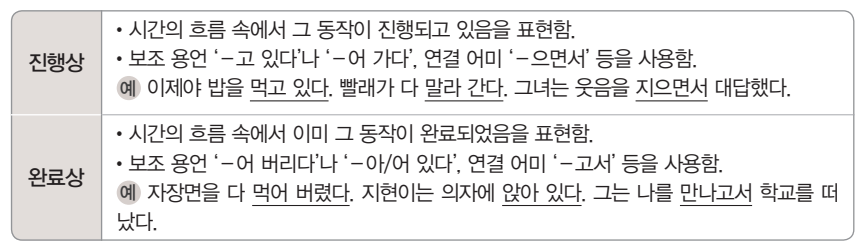 동작상은 발화시를 기준으로 동작이 일어나는 '모습'이나 '양상'을 표현하는 것입니다. 동작이 진행 중인지, 이미 완료되었는지 등을 나타냅니다.