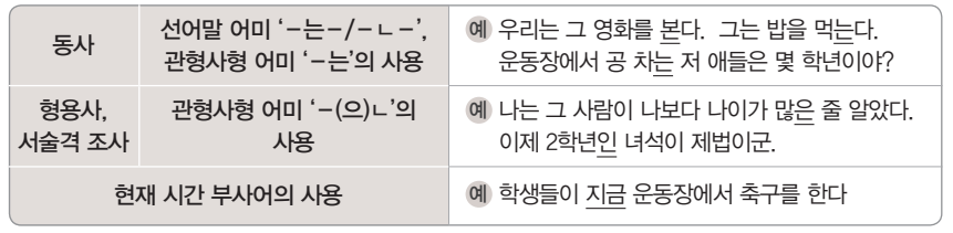 - 동사 선어말 어미 '-는-/-ㄴ-', 관형사형 어미 '-는'의 사용: